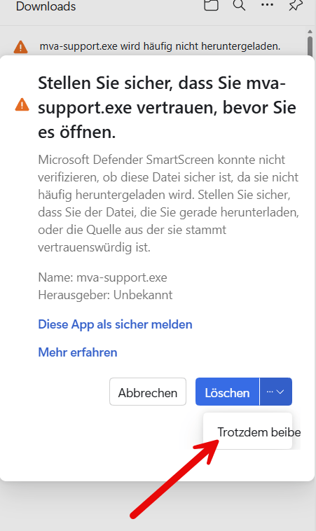 Bei Microsoft Edge kann es sein, dass der Download nicht als „sicher“ eingestuft wird. Um die Datei dennoch ausfühlren zu können hilft folgendes Vorgehen.