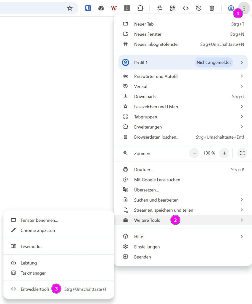 Klicken Sie in der Menüleiste von Google Chrome auf Google Chrome anpassen und einstellen (drei Punkte Menü) > Weitere Tools > Entwicklertools. Oder drücken Sie Ctrl + Umschalttaste (Shift) + I auf Ihrer Tastatur.