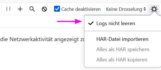 Klicken Sie auf das Zahnrad. Wählen Sie die optionale Option Logs nicht leeren an. Somit verhindern Sie, dass das Log geleert wird, wenn sie eine neue Seite besuchen. Dies macht Sinn, wenn Sie Probleme auf mehreren Seiten analysieren wollen.