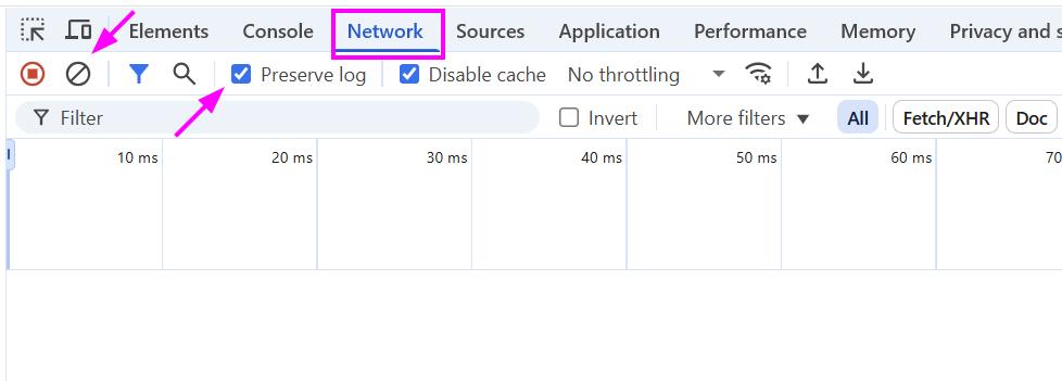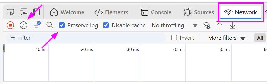 Wählen Sie die Option Protokolldateien aufbewahren (Preserve log) an. Klicken Sie das Verbotszeichen (Clear), um eventuell vorhandene Protokolle aus der Ansicht Network zu löschen.