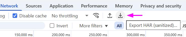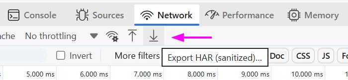 Sobald die Seite den Ladevorgang abgeschlossen hat oder Sie die Fehler erhalten haben, die Sie protokollieren wollen, klicken Sie auf Export HAR (sanitized); der Pfeil, der nach unten zeigt. Speichern Sie die Datei auf Ihrem Computer.