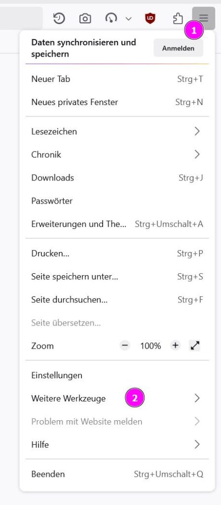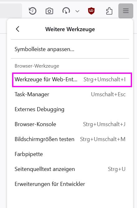 Klicken Sie in der Menüleiste (Burgermenü) von Firefox auf Weitere Werrkzeuge.