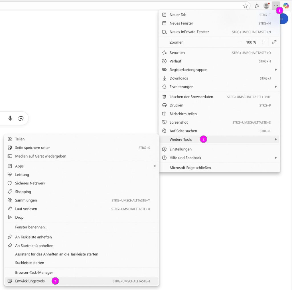 Klicken Sie in der Menüleiste von Microsoft Edge auf Entwicklungstools.