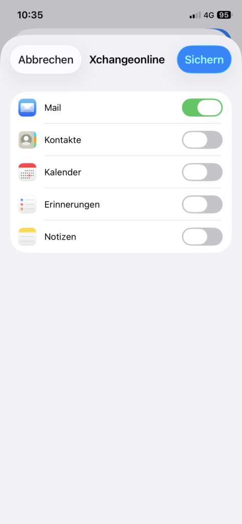 Wählen Sie die zu synchronisierenden Dienste (E-Mail, Kalender, Kontakte, ect.). Wäheln Sie danach Sichern.