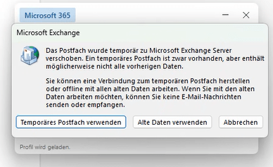 Fehlermeldung: Das Postfach wurde temporär zu Microsoft Exchange Server verschoben. Ein temporäres Postfach ist zwar vorhanden, aber enthält möglicherweise nicht alle vorherigen Daten
