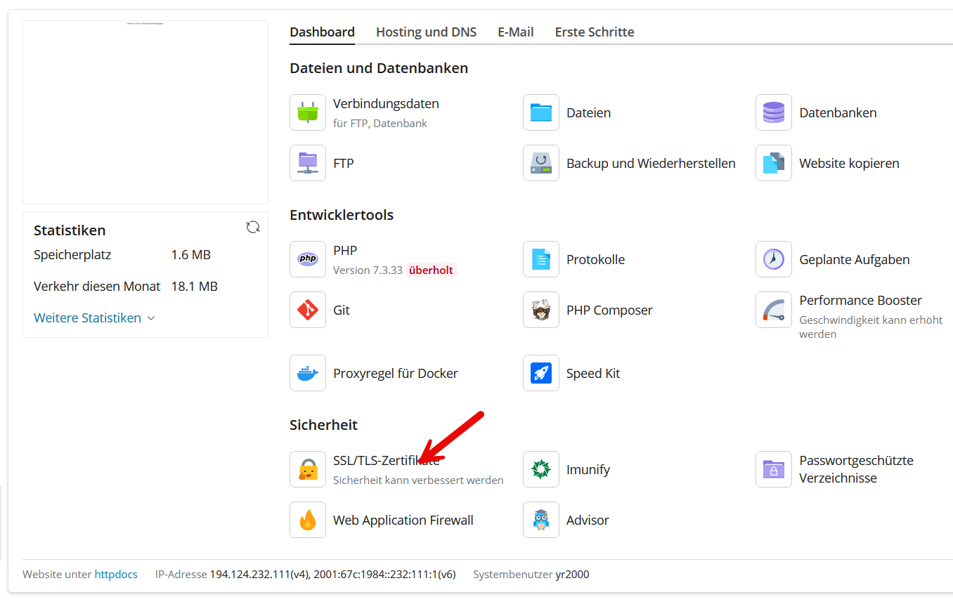 Voraussetzung ist, dass Ihre Website dies auch unterstützt (keine http:// Includes, etc). Zudem muss die Website auf dem Hosting online und lauffähig sein (DNS muss auf das Hosting zeigen).