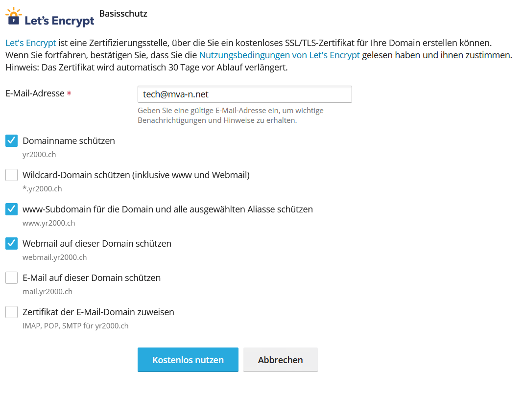 Um auch das „www“ zu sichern, müssen Sie www-Subdomain für die Domain uns alle ausgewählten Aliase schützen anwählen. Bei verwendetem Mailservice, sollte Webmail geschützt werden (optional)